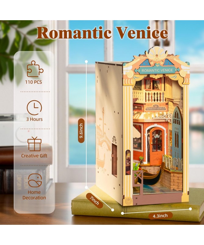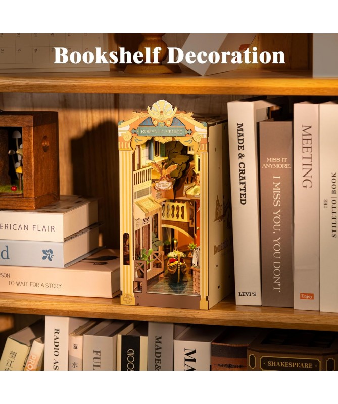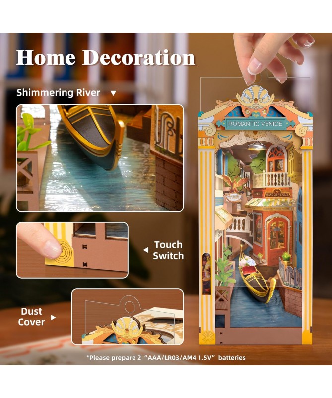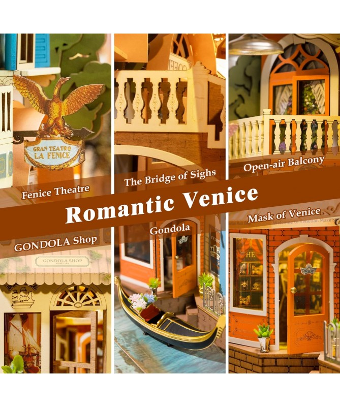 Venecia Romántica es un rincón de lectura DIY de inspiración italiana que presenta una hermosa escena de Venecia. Con iluminación, cubierta antipolvo y diseño escénico, es una decoración creativa para el hogar y una hermosa maqueta para ensamblar